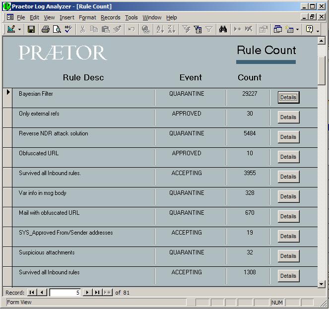 This selection from the Event submenu allows you to get a count summary of each different active rule that you have configured in Praetor.