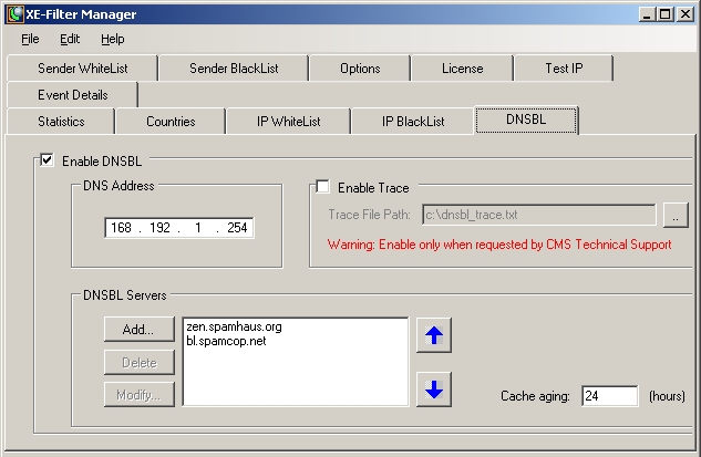 The XE-Filter "DNSBL" tab gives administrators the ability to